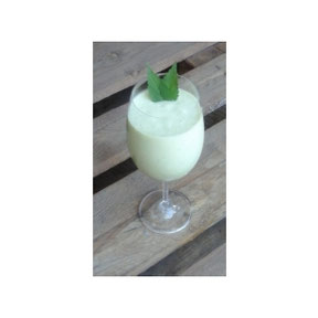 3. Doe het fruit, de kool, de skyr (of yoghurt), de muntblaadjes, het sap en de kokos in een kom en mix met de staafmixer of gebruik een blender.